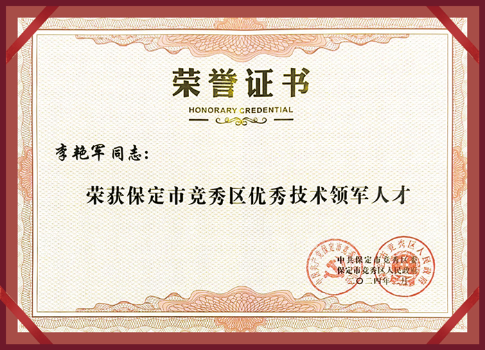 同時,李艷軍先生也榮獲“保定市競秀區(qū)優(yōu)秀技術(shù)領(lǐng)軍人才”榮譽稱號,并上臺領(lǐng)取了證書。這個榮譽是對他過去辛勤工作和取得成績的肯定,也是對他未來發(fā)展的鼓勵。他表示,這個榮譽將激勵他更加努力,在公司的發(fā)展中更加積極地貢獻自己的力量,為競秀區(qū)經(jīng)濟的進一步發(fā)展作出更大的貢獻,并由衷的感謝區(qū)領(lǐng)導的嘉獎和認可,并表示衷心感激!